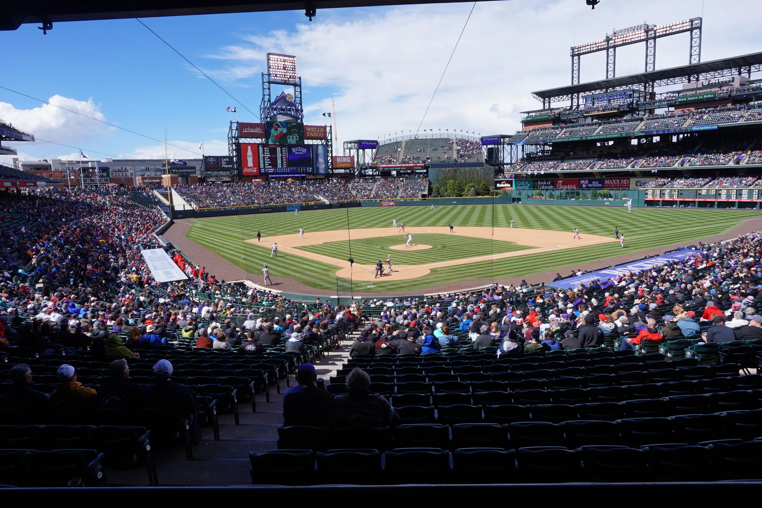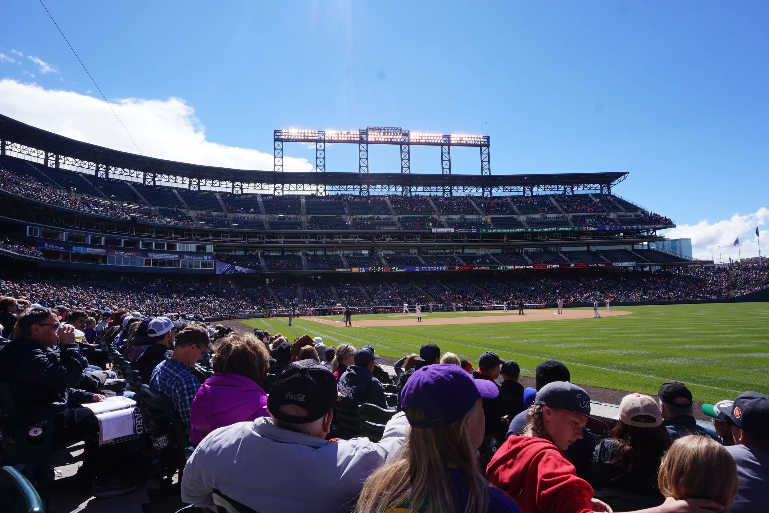 For privacy reasons we’ll call him Freddy*. Freddy had four tickets to the baseball game that was currently playing across the street at Coors Field. Although the game was at its 7th inning Freddy insisted on going to the game. I told him it seemed pointless but then said “well who cares…at least you could say you were able to go to a baseball game while being here.” After chugging our beer, walking to the field with a minor buzz, I practically sat on the field at my first Colorado baseball game.