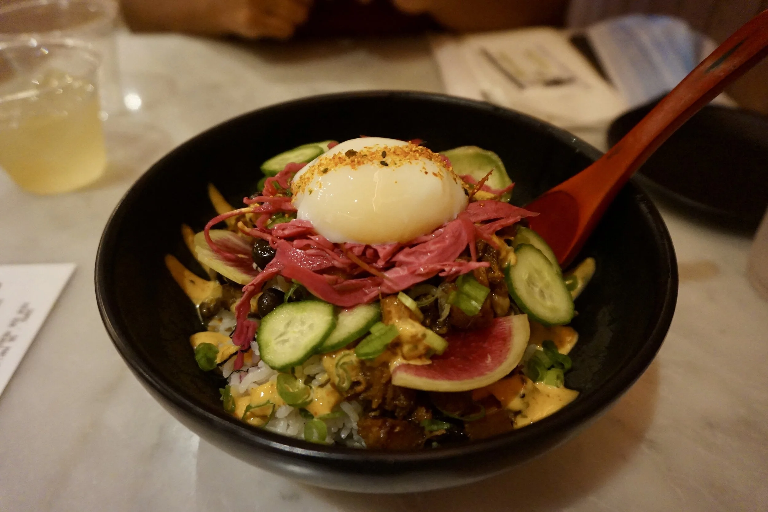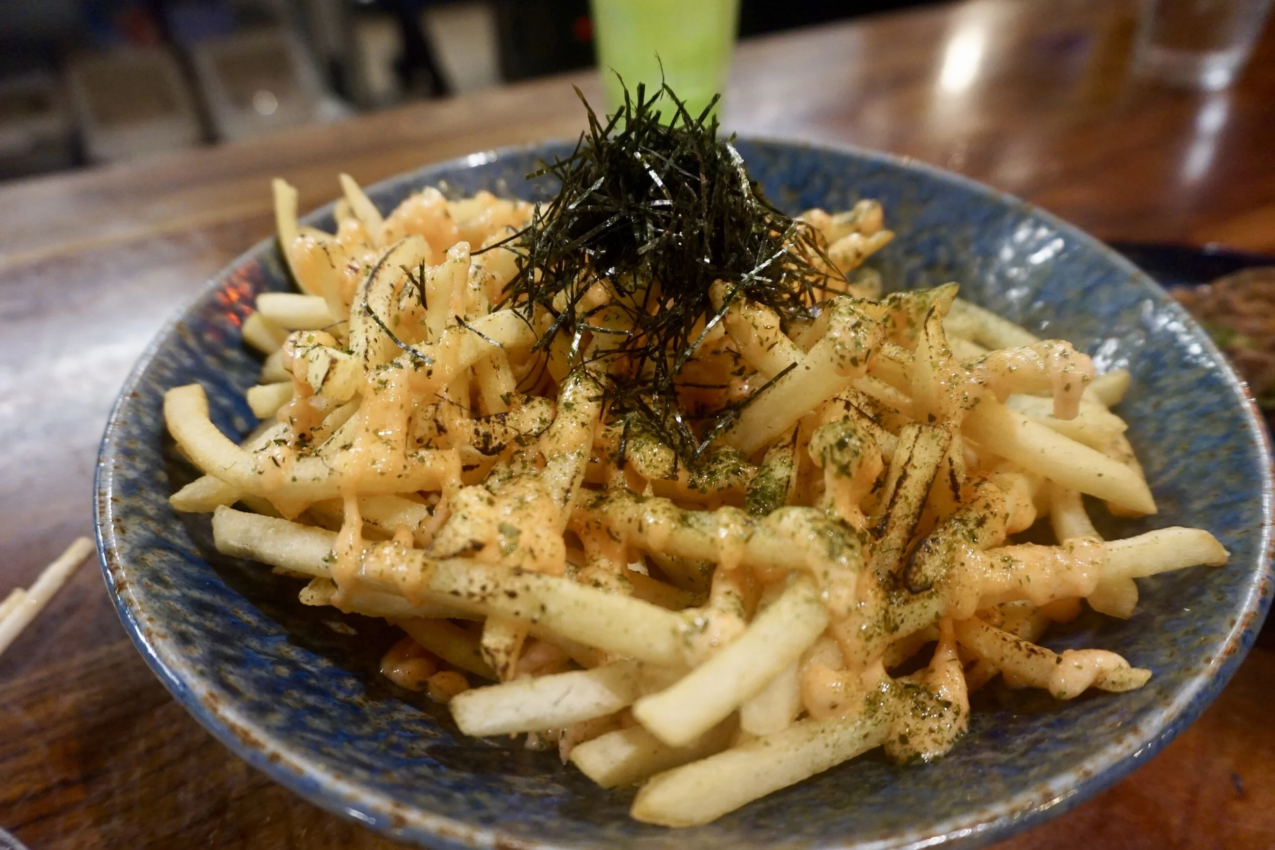 What makes Susuru one of my favorite Japanese restaurants is how playful and energetic the space is. Home to the anime lovers this spot brings to you a combination of Japanese memorabilia both past and present with “instagramable” cocktails and authentic Japanese street food. I discovered this place by accident after coming out of work. I met up with my boyfriend next door at a bar and their kitchen was closed. I was starving and decided to walk down the street to see what else might be open and there it was. The restaurant almost had a gastro pub feel to it, everyone was dressed casual, laughing, having a good time eating what looked like good food and I immediately rushed inside. Everything on the menu was cheap and the drinks seemed so fun and interesting. My favorite thing to order is the Chicken Karaage which is Japanese fried chicken (don’t forget to squeeze the lemon all over it) with a side of yuzu mayo and their Mentaiko Fries, which are skinny fries drizzled with spicy cod roe mayo topped with nori.