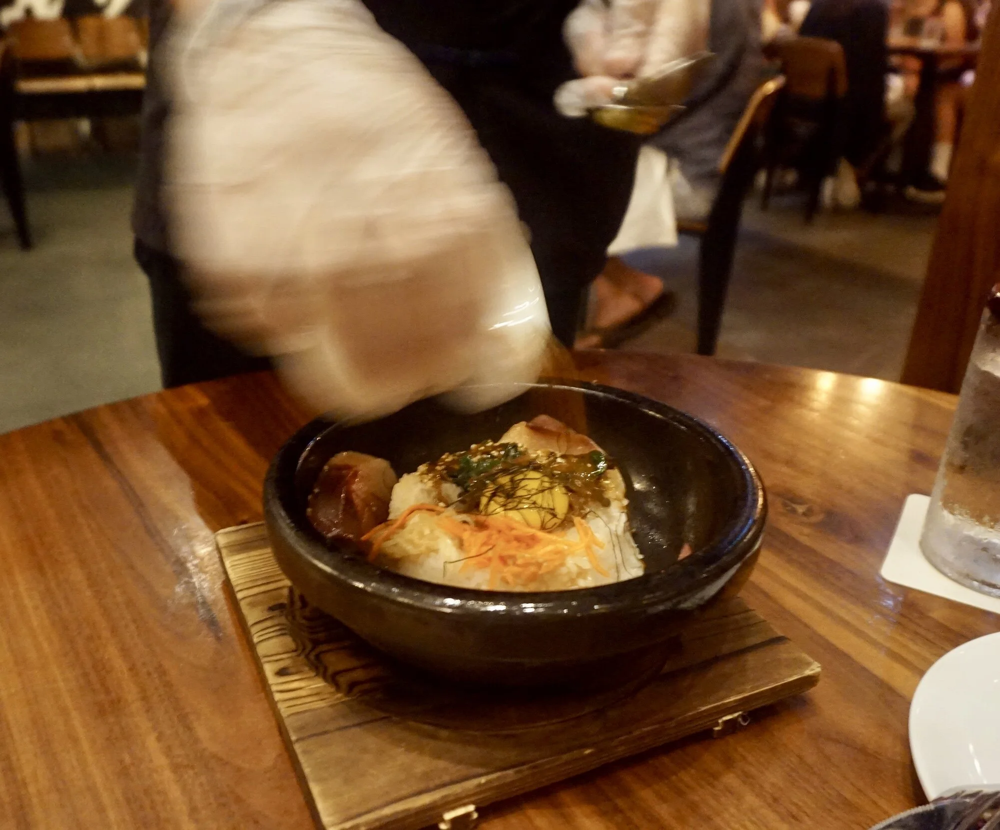 If you’ve lived in Orlando long enough you would know that certain areas lack true cultural influence. Although Morimoto Asia is located in Disney Springs, they do an excellent job staying authentic and making their guest feel transported to a cosmopolitan environment. The moment you take your first steps into this beautifully lit building you are draped with hanging chandeliers, access to two bar lounges, and a grand staircase that takes you not only to their sushi bar but also private dining areas. The first time I came here was for my mother’s birthday. We both had a glass of wine, a sushi roll to share, and I ordered the Buri-Bop. The Buri-Bop is what Chef Masuhara Morimoto is known for, alongside his feature in Iron Chef and opening many restaurants, this entrée has been featured in Food&Wine. The buri-bop is mixed rice topped with Hamachi, vegetables, egg yolk, and shredded nori all cooked and served in a cast-iron bowl and It is absolutely amazing.